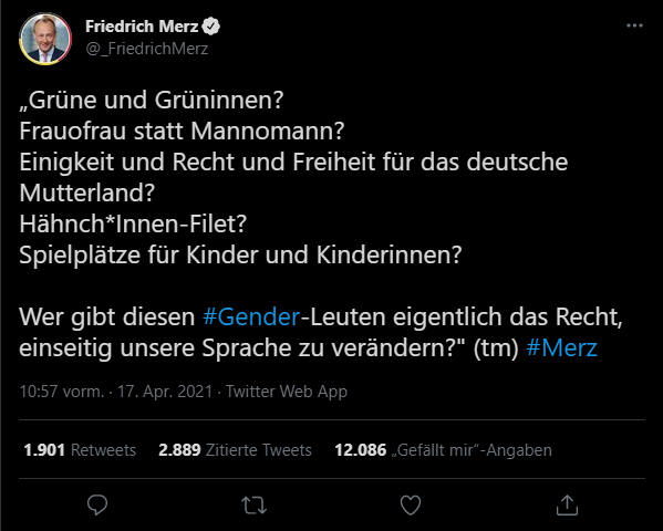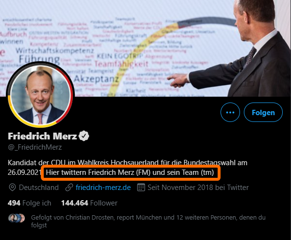 Also twittern hier doch neben Friedrich Merz (FM) auch noch sein Team (TM). Was es wie ich finde, aber nur noch viel schlimmer macht, dass sich das Team Social Media auch noch mit so einem Schwachsinn meldet. Also haben die das doch sicher Ihrem Chef vorgestellt, der fand das eine gute Idee und dann Feuer frei, Nebelgranate gezündet, wie der Lanz das immer so gerne nennt.